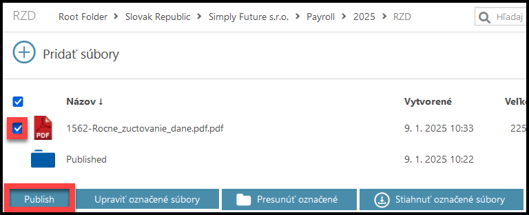 - Keď nahrajete súbory do daňového priečinka a stlačíte tlačidlo Publikovať, zamestnanci môžu vidieť a stiahnuť si svoje súbory. E-mailové upozornenie je odoslané všetkým vybraným zamestnancom.