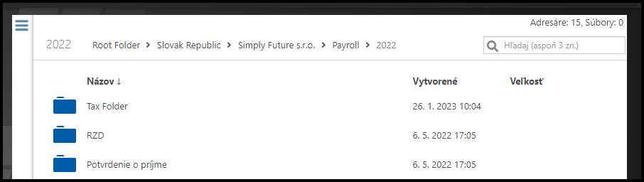 Nasledujte cestu k priečinku: Koreňový priečinok » Krajina, v ktorej je spoločnosť » Názov spoločnosti » Payroll (Mzdy) » Rok » Názov priečinku pre zúčtovanie dane (napr. RZD)