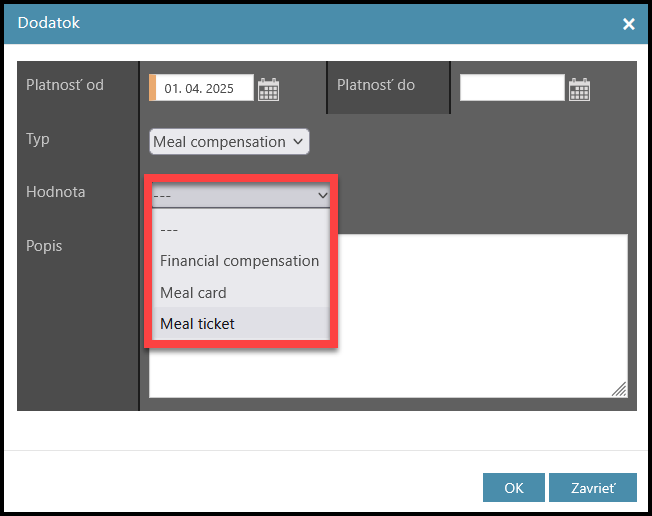 Ak chcete filtrovať iba určitý typ, zvoľte typ dodatku (napríklad Stravné).