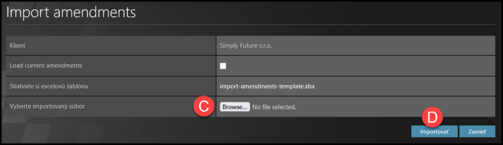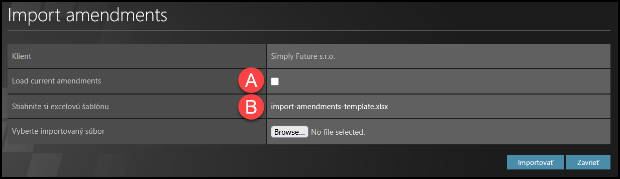 Nové dodatky: Kliknite na “import-amendments-template.xlsx”, aby ste stiahli prázdnu šablónu.
