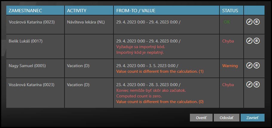 - ERROR – chyba zobrazená červenou farbou – tento riadok nie je možné importovať – tlačidlá Overiť a Odoslať sú preto sivé a nefungujú. Pozrite si popis chyby. Riadok musíte upraviť alebo odstrániť.