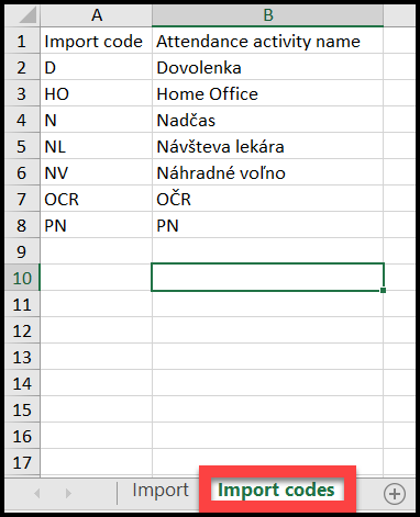 - Import code – Importovací kód – zadajte kód dochádzkovej aktivity (podľa zoznamu kódov).