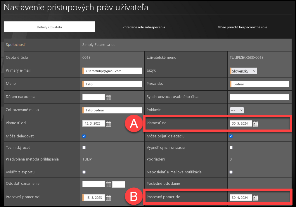 - Dôvod je ten, že akonáhle je dátum “Pracovný pomer do” vyplnený, a dátum “Platnosť do” je prázdny, dátum “Platnosť do” sa v TULIPe automaticky vyplní. Týmto spôsobom môže zamestnanec pristupovať k svojmu profilu aj po dátume ukončenia pracovného pomeru na zobrazenie a stiahnutie výplatných pásiok. Nemá žiadny iný prístup okrem tohto. Obdobie, po ktoré môže zamestnanec zobraziť a stiahnuť výplatné pásky, je definované v nastaveniach spoločnosti a zvyčajne trvá 30 až 90 dní.
