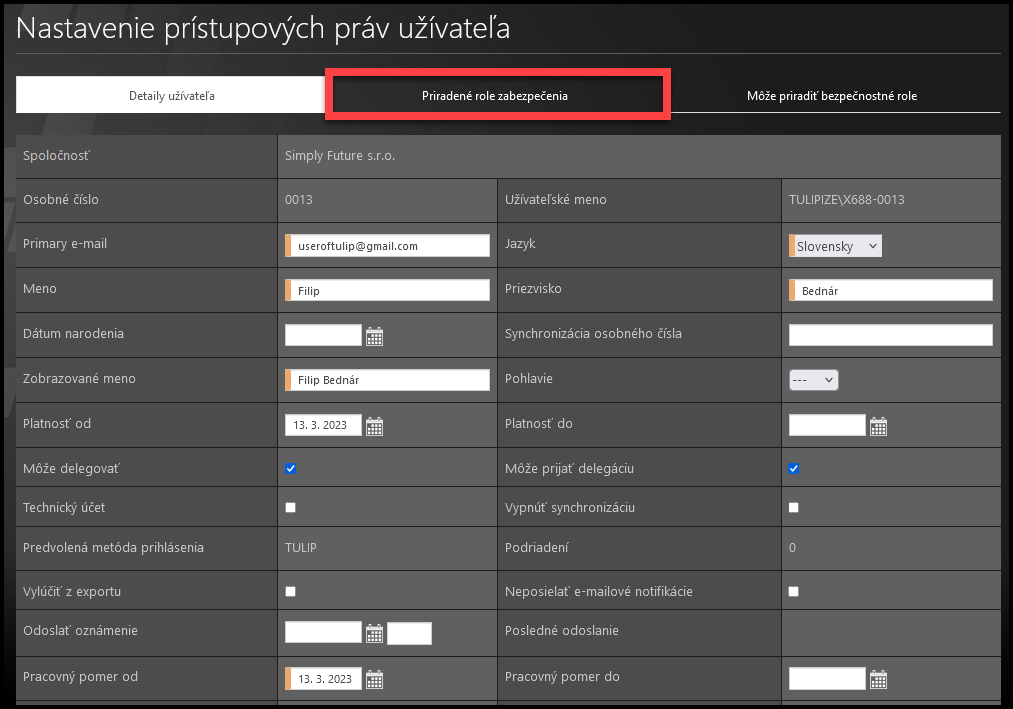 Upozorňujeme, že nastavenie TULIP-u, ktoré vidíte, vždy závisí od individuálnych požiadaviek a nastavení prístupu TULIP-u pre vašu spoločnosť. Nie všetky spoločnosti využívajú túto funkciu v administrácii zamestnancov.