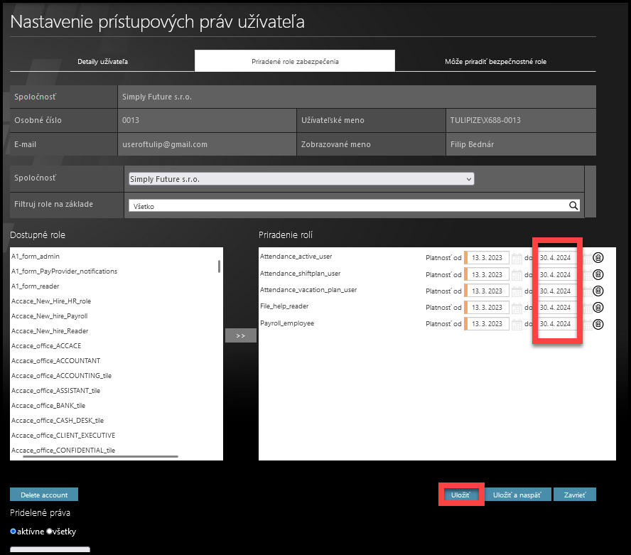 - Ak chcete pridať ďalšie role – pridajte nové role zo zoznamu rolí na ľavej strane: dvojklikom presuňte rolu do pravého zoznamu.