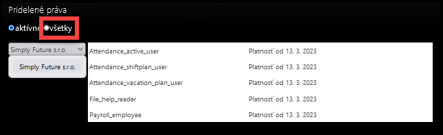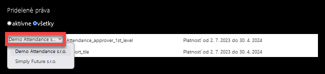 Vyberte spoločnosť zo zoznamu, aby sa zobrazili prístupové role v tejto spoločnosti (vrátane zrušených).