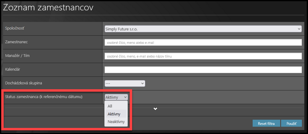 Ak prístup zamestnanca aktuálne nie je “Aktívny”, prejdite k Statusu zamestnanca filtrovania a vyberte stav Neaktívny. To umožní zobraziť zamestnancov, ktorých zmluva už skončila alebo ešte nezačala.