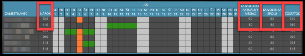 Napríklad: Nároky 20 dní – Dovolenka tento mesiac 5 dní = Zostatok 15 dní