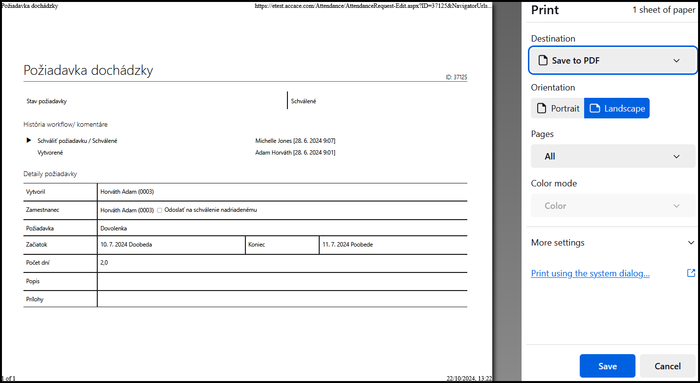 Otvorte detail požiadavky a kliknite na tlačidlo Tlačiť dolu na obrazovke.