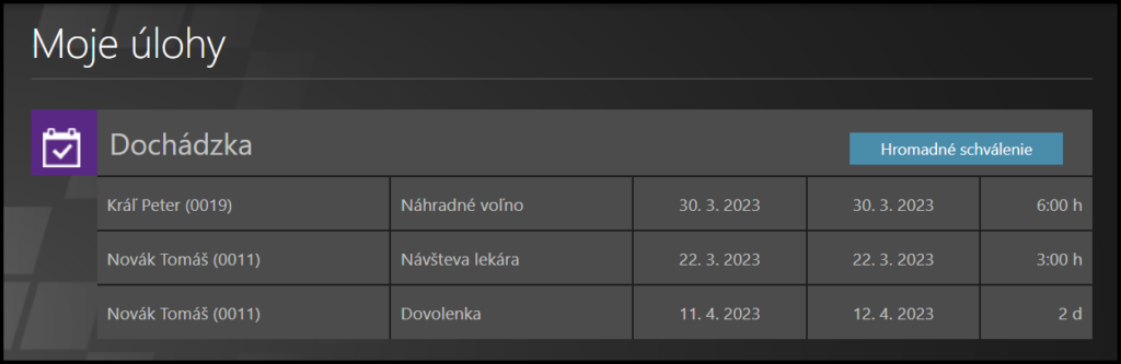 1. Schváliť žiadosti zamestnancov – viacero požiadaviek naraz prostredníctvom Hromadného schvaľovania dochádzky, alebo cez dlaždicu Moje úlohy.