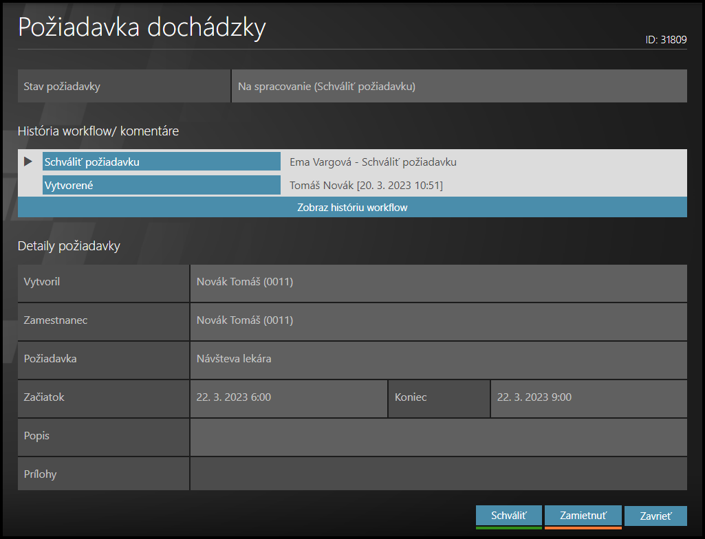 Ak chcete otvoriť podrobnosti požiadavky, kliknite na  meno zamestnanca.