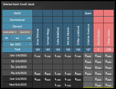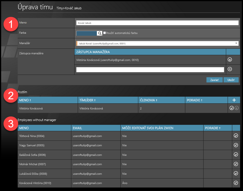 - Dostupní zamestnanci – Zamestnanci, ktorým je potrebné priradiť tímového lídra. Zamestnanci podtímov sa tu nezobrazujú, sú dostupní osobitne v sekcii podtímov.