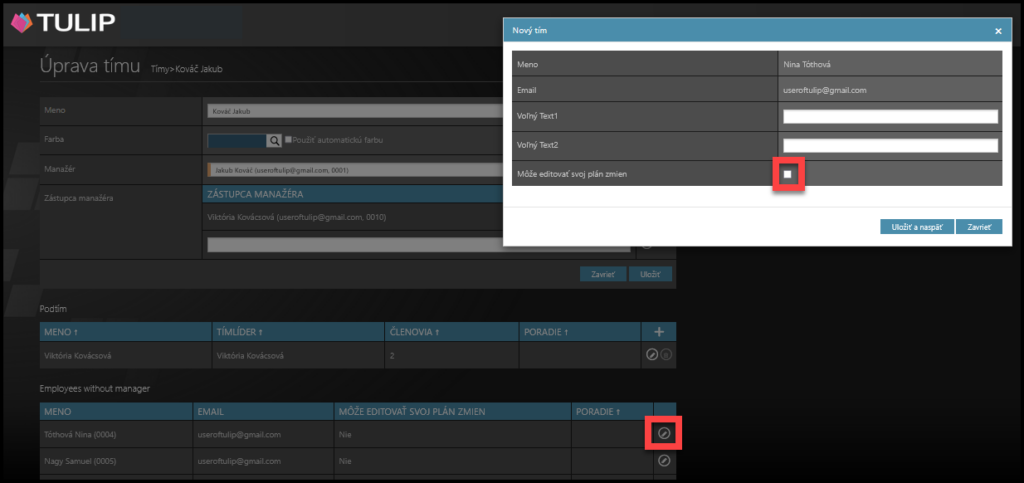 Ak chcete, aby si zamestnanec mohol upravovať svoje vlastné zmeny, kliknite na ikonu ceruzky a potom zaškrtnite checkbox v novom okne.