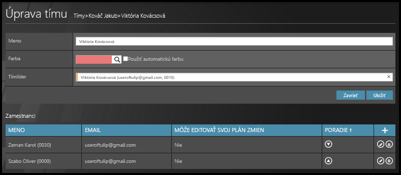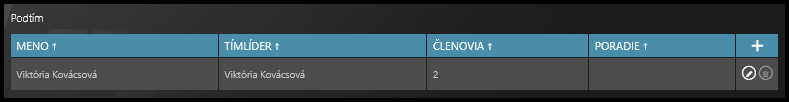 - vymazanie tímu kliknutím na ikonu koša (len ak tím nemá aktívnych zamestnancov)