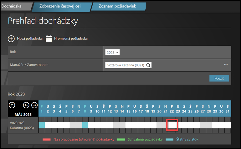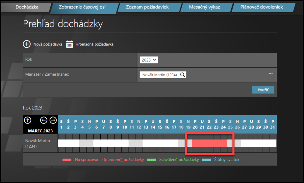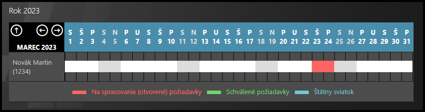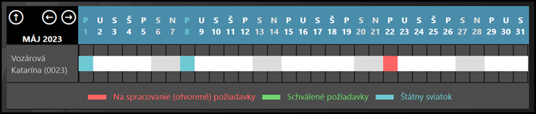 Teraz môžete vidieť červené políčka pre všetky požadované dni, čo znamená, že čakajú na schválenie. Po schválení sa farba zmení (v závislosti od typu požiadavky).