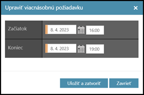 • Zmena požiadavky – Kliknite na ikony kalendára, vyberte dátumy a čas. Kliknite na tlačidlo Uložiť zmeny.