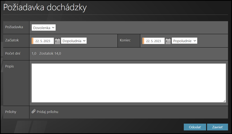 • Vyberte typ požiadavky (dovolenka, nadčasy, práca z domu …)