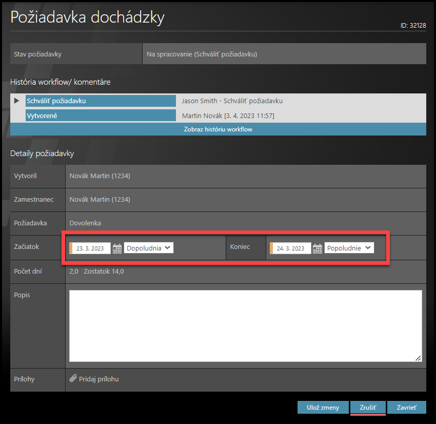 • Ak požiadavku nemôžete zmeniť, bude možné len odstránenie požiadavky – Kliknite na tlačidlo Zrušiť a táto informácia sa odošle manažérovi na schválenie. Počkajte na schválenie a vytvorte novú požiadavku.