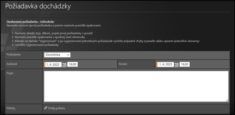 Jedná sa o funkciu dochádzky, kde môžete vytvoriť menší počet rôznych požiadaviek.