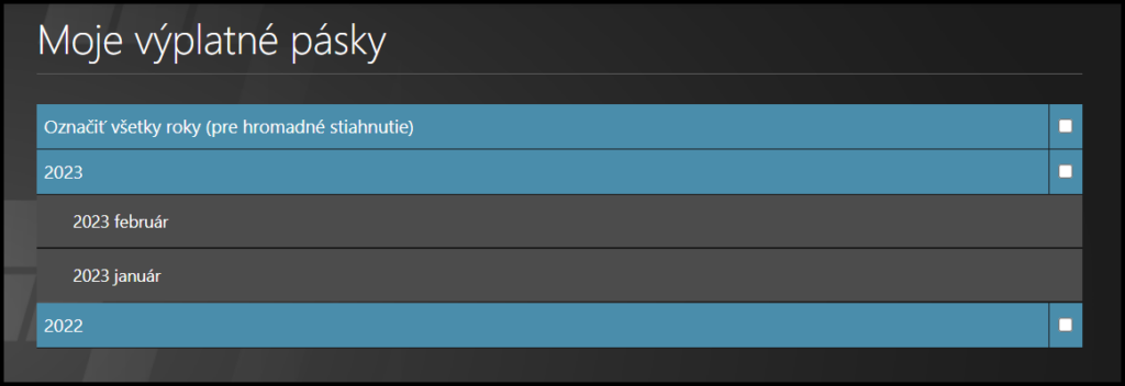 Prednastavené zobrazenie ukazuje všetky dostupné výplatné pásky za tento rok od najstaršej po najnovšiu.