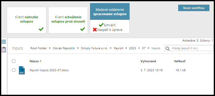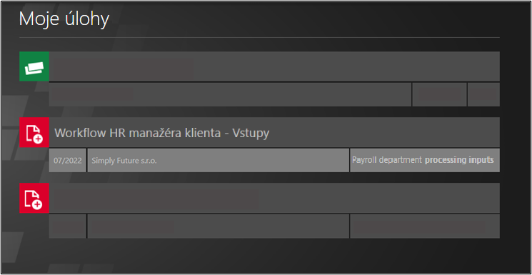 Aktuálny stav workflow v priečinkoch miezd je vždy zobrazený ako ikona : workflow nie je spustený (čierna), workflow prebieha/čaká na akciu (modrá), workflow je ukončený (zelená).