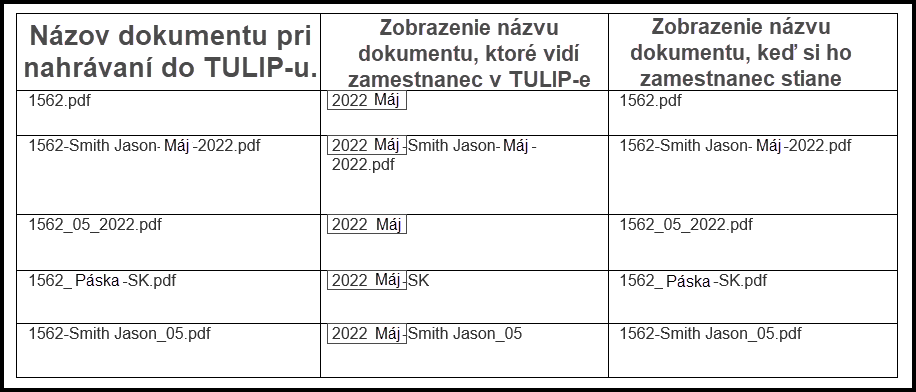 Súbor musí byť uložený s názvom v stanovenom formáte. Týmto spôsobom môže TULIP priradiť a poslať súbor správnemu zamestnancovi.