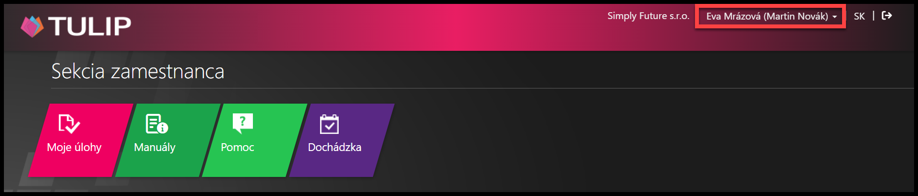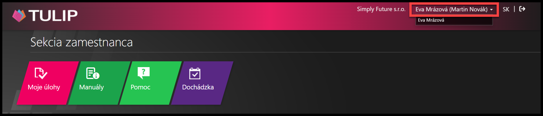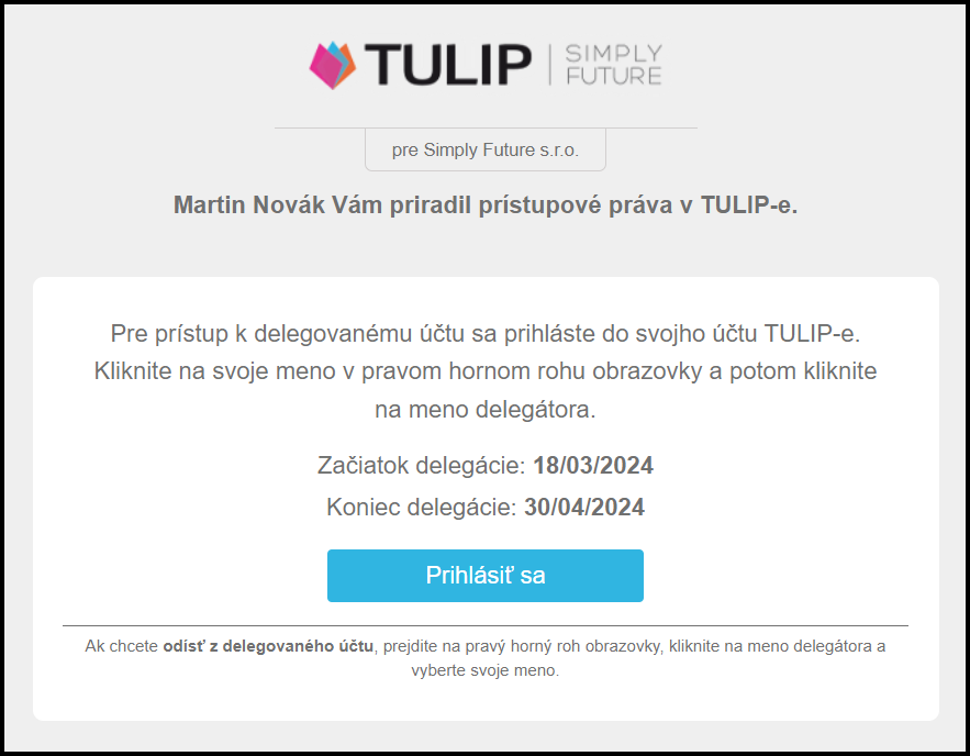 Upozorňujeme, že nastavenie TULIP-u, ktoré vidíte, vždy závisí od individuálnych požiadaviek a nastavení prístupu TULIP-u pre vašu spoločnosť. Nie všetky spoločnosti/používatelia využívajú funkcionalitu delegácie.