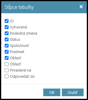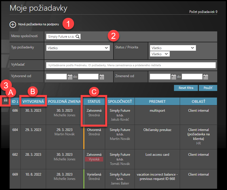 Kliknutím na ľubovoľný modrý nadpis zoradíte a usporiadate požiadavky.