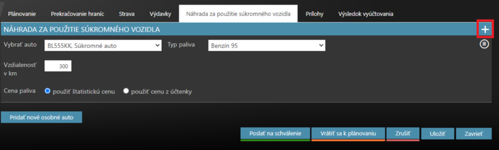 Kliknite na ďalšiu záložku nazvanú Náhrada za použitie súkromného vozidla (kompenzácia za palivo), ak ste použili súkromné vozidlo na služobné účely.
