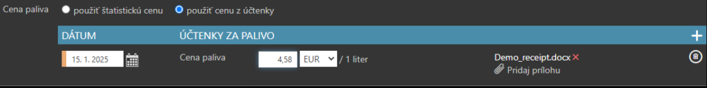 - Cena paliva – použite štatistickú cenu alebo kliknite na políčko použiť cenu z účtenky.