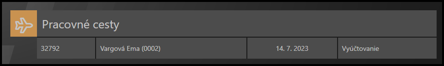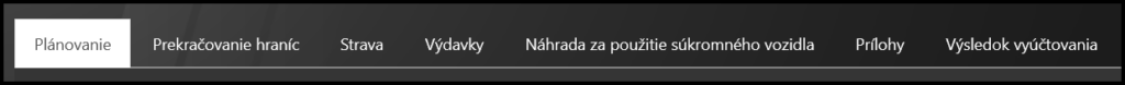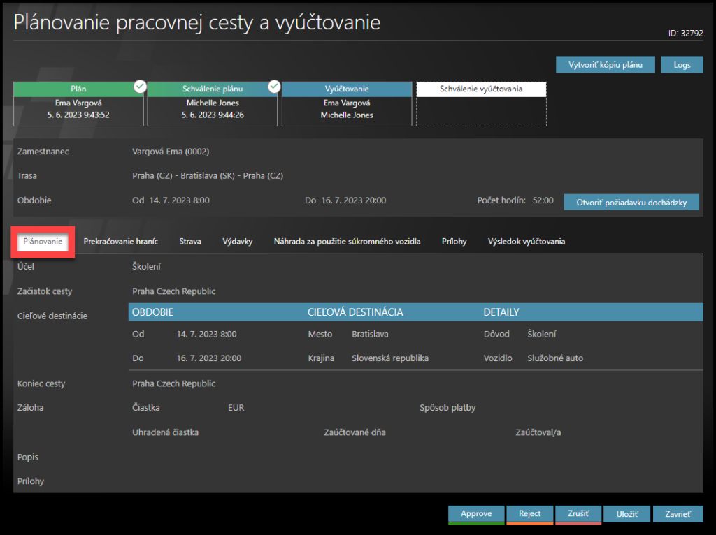 - Plán – podrobnosti o pláne služobnej cesty a výpočet platby vopred