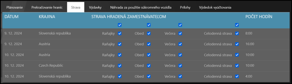 ✔ zaznamenať všetky krajiny, vozidlá, jedlá a poplatky za všetko, čo bolo potrebné uhradiť počas pracovnej cesty