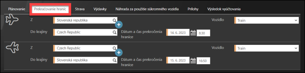 - Čas prekročenia hranice – zadať čas prekročenia hranice vozidlom alebo čas pristátia lietadla v destinácii