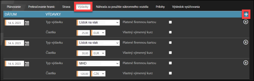 Sekcia nákladov je jednou z najdôležitejších v celom formulári. Uveďte všetky dodatočné náklady spojené so služobnou cestou, ktoré by mala zaplatiť spoločnosť. Niektorí klienti majú automaticky vyplnené plánované náklady do časti Náklady.