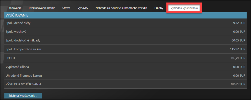 Nakoniec kliknite na záložku Výsledok vyúčtovania.