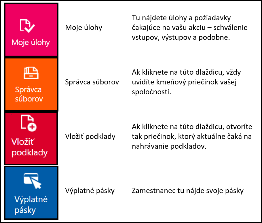 Upozorňujeme, že nastavenie TULIP-u, ktoré vidíte, závisí vždy na individuálnych požiadavkách a nastaveniach prístupu do TULIP-u pre vašu spoločnosť. Nie všetky spoločnosti využívajú funkciu Payroll (mzdového účtovníctva).