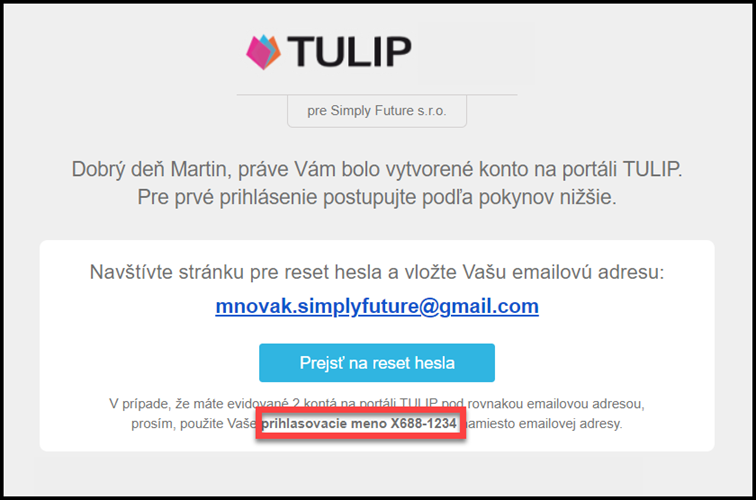 Namiesto e-mailovej adresy použite svoje prihlasovacie meno. Nájdete ho aj v prvom e-maile od TULIP-u.