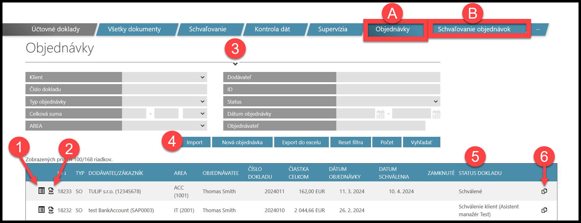- Karta Schvaľovanie objednávok – vidíte iba objednávky čakajúce na vašu akciu.