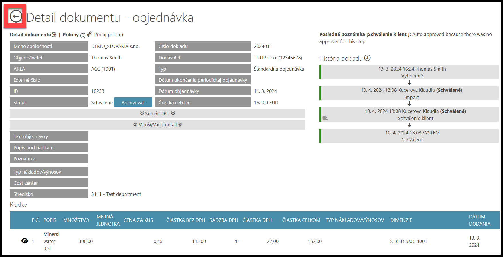 - Schváliť objednávku – odošle dokument ďalšej osobe v procese schvaľovania.