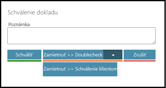 - Zamietnuť – Schválenie klientom = Odoslať späť predchádzajúcemu schvaľovateľovi. Objednávka sa posunie o jeden krok späť podľa matice/workflow. Je nutné pridať komentár.Zamietnuť – Doublecheck = Vrátiť objednávku na prvý krok. Takto môžete zmeniť OBLASŤ (proces schvaľovania) objednávky. Je nutné pridať komentár.