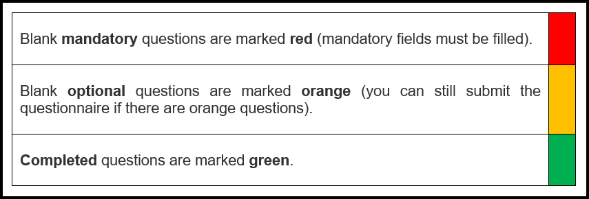 - Click SAVE – you can save the answers and to return to the Questionnaire later. To return to the saved Questionnaire, go to My Tasks tile.