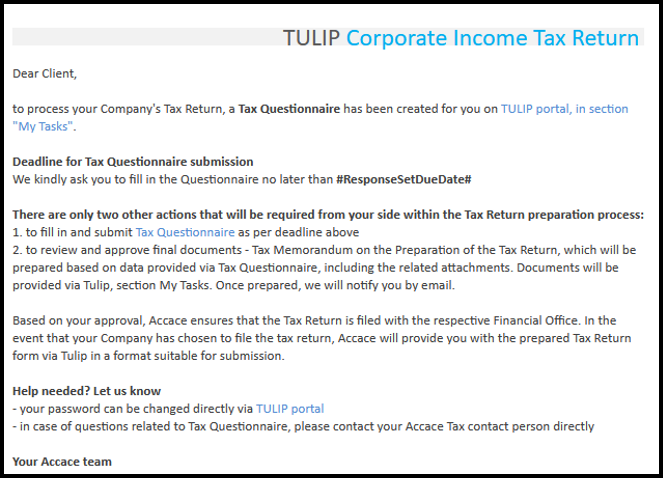 As an authorized person on the client’s side, you can exchange information with a Tax advisor through TULIP. Use a tax Questionnaire uploaded into your account – via the Questionnaire, you can safely share necessary data and information and upload mandatory documents. This guide describes the most common questions and also the entire process.