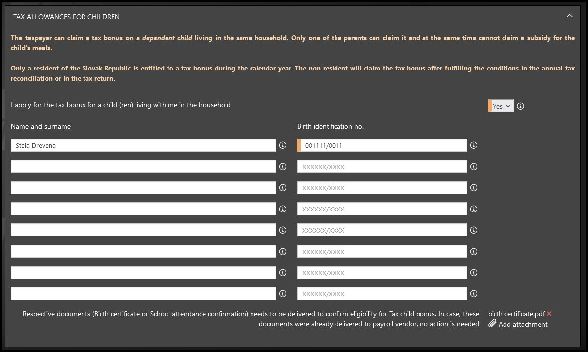 If you are applying for the tax bonus for a child living with you in one household, please fill in the child’s first and last name and the child’s birth number. If the child has not been allocated a birth number, fill in the child’s date of birth in the form YYYYMMDD/0000 instead.