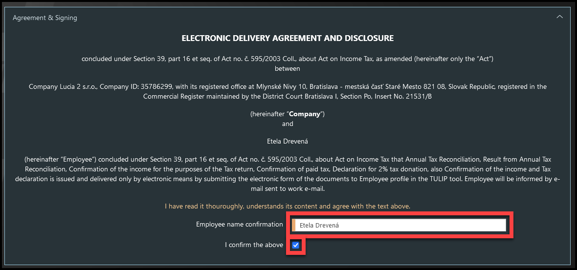 - Sign – You can click on this button only if you completed the whole form, signed it (filled in the date and your name in the signature part & agreement part and ticked the checkboxes). It saves and sends all the data to HR/Payroll for processing. You cannot edit the data after clicking on this button.